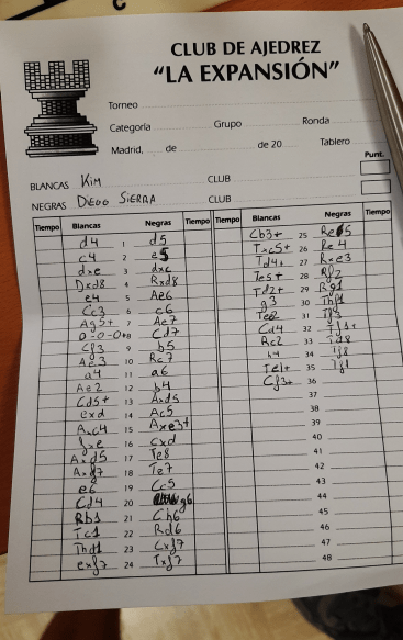 Ah! Y se me olvidaba. Por si alguien quiere tener un recuerdo vivo de lo que fue el torneo, Diego Sierra, uno de los participantes anotó su partida con Kim y que os dejamos a continuación por si alguien desea reproducirla: